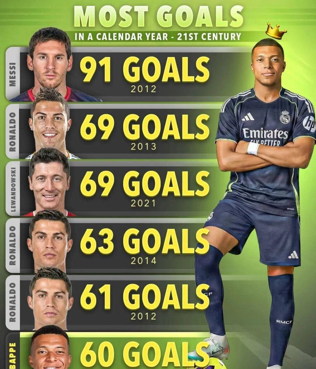 那么问题来了:接下来这一个月,姆巴佩能否在这5场比赛里打入10球?这个数字不仅仅是一个简单的进球目标,它关系到一个极具历史意义的排名——自然年个人正式比赛总进球排行榜。目前,该榜由梅西和C罗称霸,两人分别占据第一和第二名的位置,梅西以2012年整年轰入91球领先,而紧随其后的是C罗2013年的69球,二者之间相差22球。尽管要超越梅西的神话难度极高,但挑战C罗的位置却并非遥不可及。